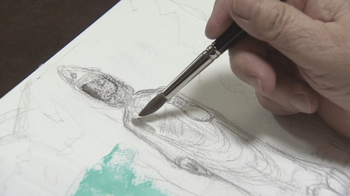戦後、寺に建てられた「平和観音」。堤さんは絵筆をとって、原爆で亡くなった人々の霊をとむらいます。
