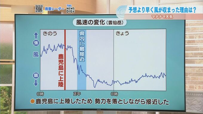 台風10号の接近による風が1番強かったのは、長崎県では接近前の29日午前中でした。予想よりも早く風が収まったのは、台風が鹿児島に1度上陸したためとみられます。台風が上陸すると、台風の勢力を強める水蒸気の補給が減り、勢力を維持することができなくなります。そのため、勢力を落としながら長崎に接近したため、風も早めに収まったとみられます。