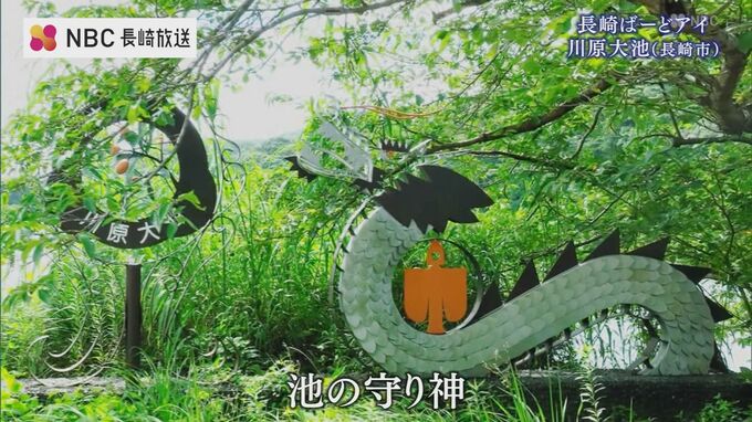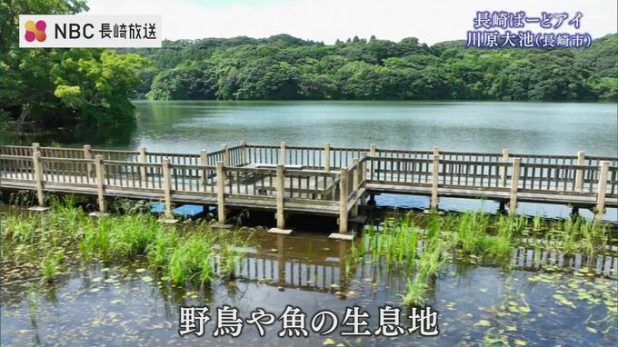 【川原大池】野母半島県立公園の中心に位置し、清流と緑と太陽、青い海など豊かな自然があふれ、古くから神秘的な阿池姫伝説が言い伝えられています。広さ13ヘクタール、周囲約1.9キロメートル最大水深約9メートルの長崎県内最大の天然の淡水湖で、野鳥や淡水魚が多く生息し、一帯にはハマナツメをはじめとするオオクグ、テツホシダなど貴重な植物が多く、「川原大池樹林」として、長崎県指定の天然記念物になっています。湖畔の遊歩道を散策すれば、季節によってさまざまな水と森の自然にふれ合うことが出来ます。また、公園内には珍しい蛇紋岩海岸に面して川原海水浴場やキャンプ場があり、シーズンにはバードウォッチング、キャンプ、海水浴や夏祭りなどで賑わっています。(長崎市)