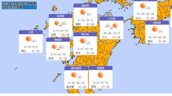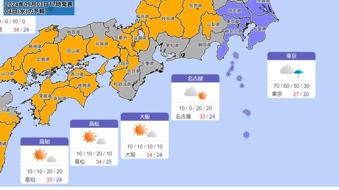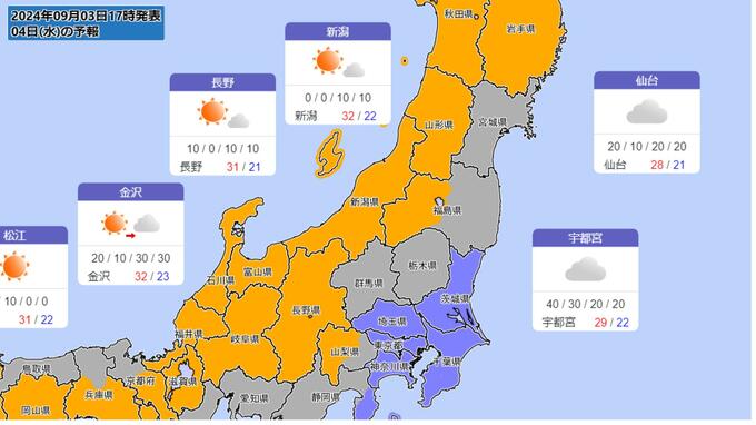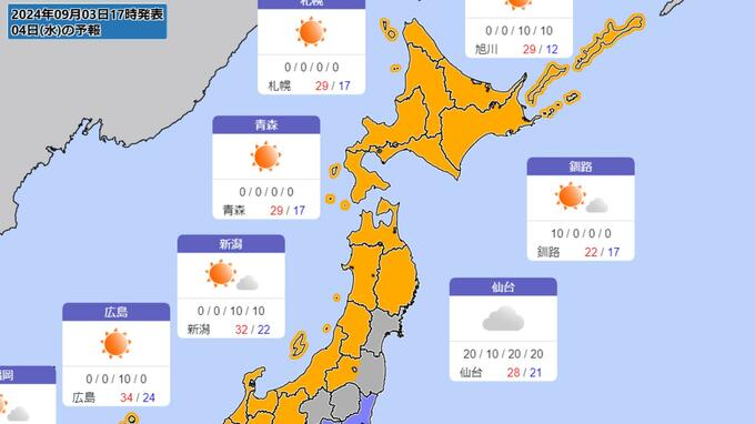 高気圧に覆われて晴れる日や暖かい空気が流れ込む日があるため、東日本では6日(金)~7日(土)にかけて、西日本では8日(日)にかけて、最高気温が35度以上の猛暑日になるところがある見込みです。熱中症対策など健康管理に注意してください。(9月3日15時00分 気象庁発表)