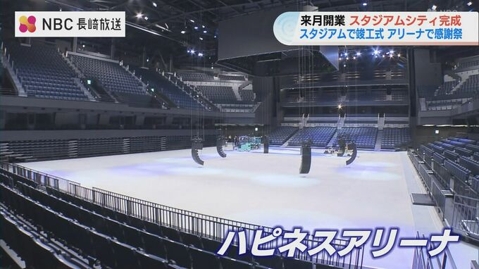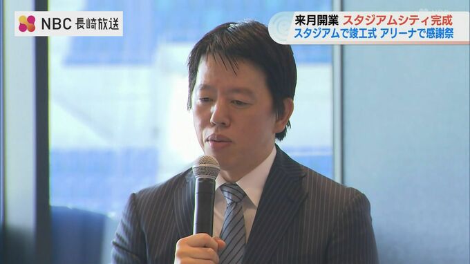 6日、サッカースタジアムで執り行われた竣工式にはプロジェクトや建設に携わった関係者およそ480人が出席して施設が無事に完成したことを祝いました。今後は各テナントの工事などを残すのみとなっています。V・ファーレン長崎のホームとなる、およそ2万人収容のピーススタジアムの他、長崎ヴェルカのホームで音楽イベントなどにも対応するハピネスアリーナ、さらにホテルやオフィス棟、商業施設なども備えています。年間850万人の利用と1万3千人の雇用創出が見込まれています。