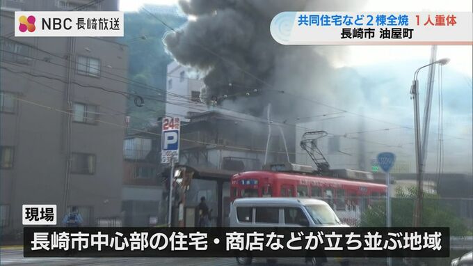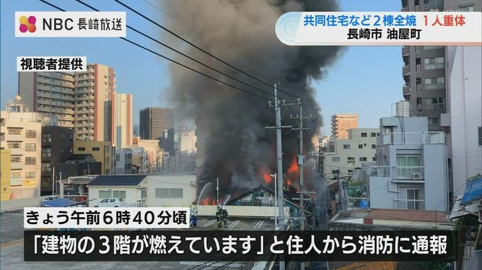 9日朝、長崎市中心部で共同住宅など2棟を全焼する火事があり、3人が病院へ搬送されうち1人が意識不明の重体となっています。
