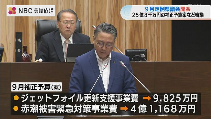 補正予算案では老朽化している壱岐・対馬と博多を結ぶ高速船「ジェットフォイル」の更新支援事業費として9800万円。赤潮の被害を受けた養殖事業者への緊急対策事業費として4億1000万円あまりが盛り込まれています。