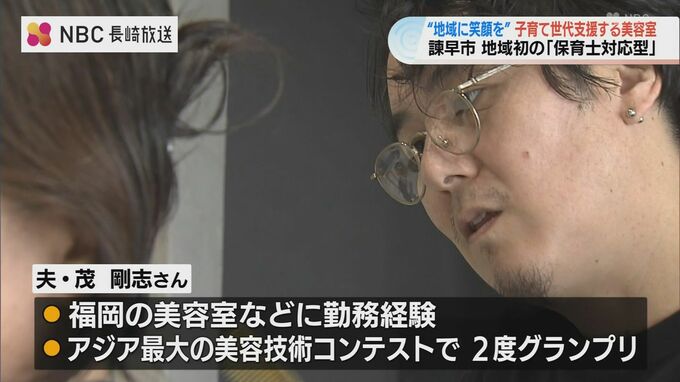 諫早市の商店街にオープンした美容室「SHIGE(しげ)」。営むのは自身も子育て中の茂さん夫妻です。
