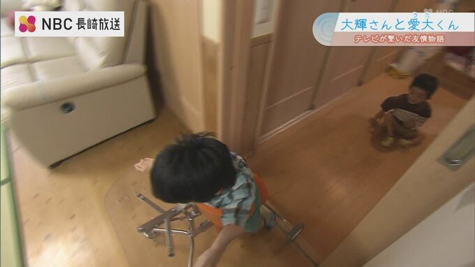 少しずつ乗りこなしている「歩行器」にまたがり、歩いて玄関まで出迎えた大輝さん。そこに、祖母に抱えられた愛大さんがやってきました。