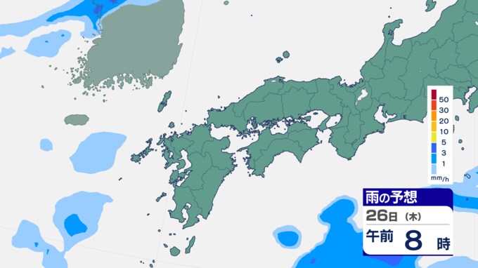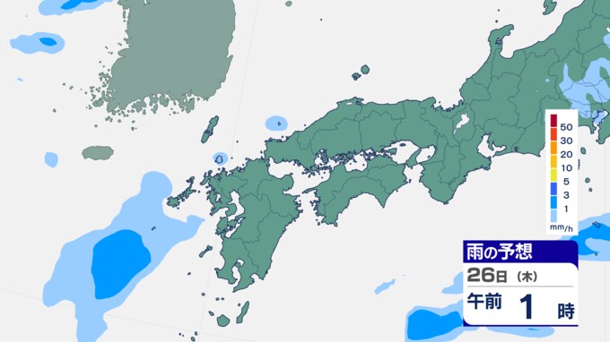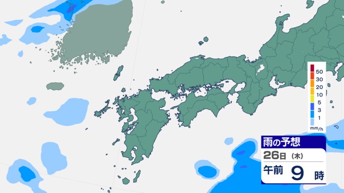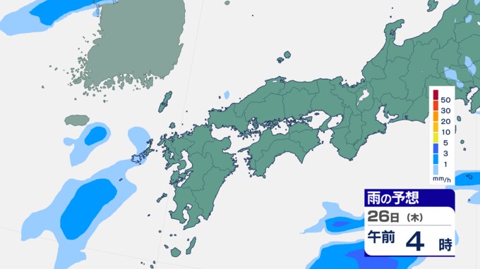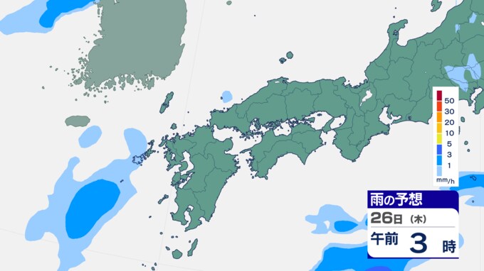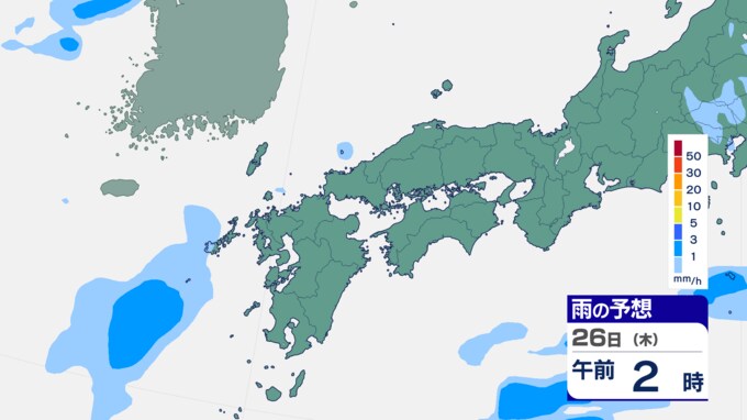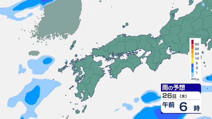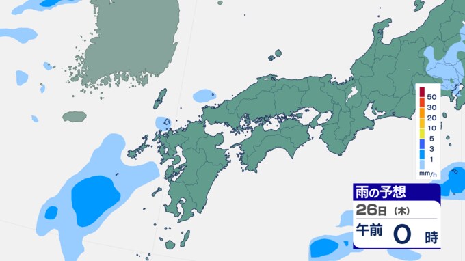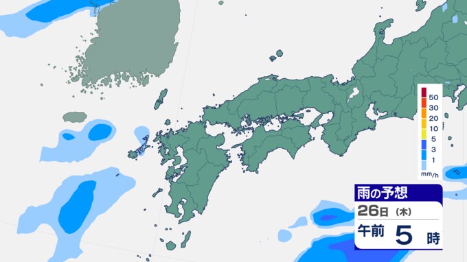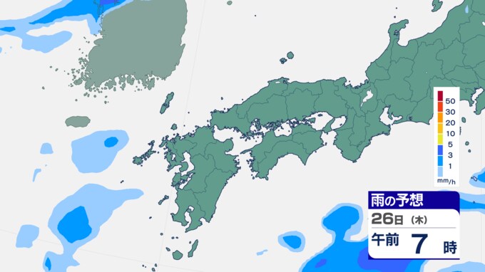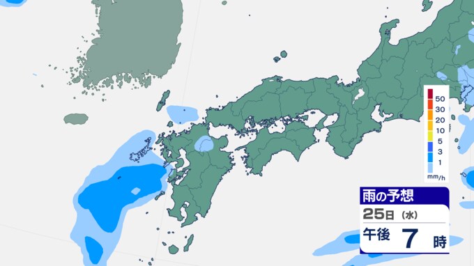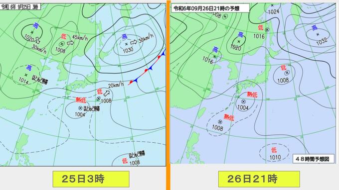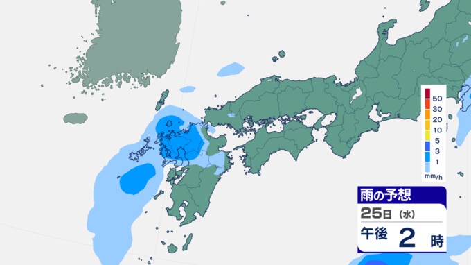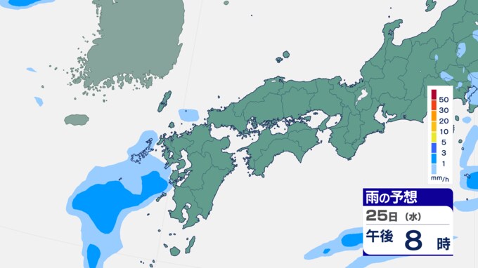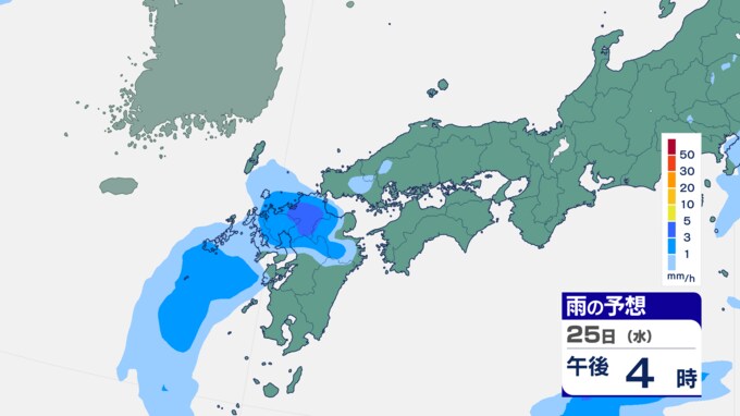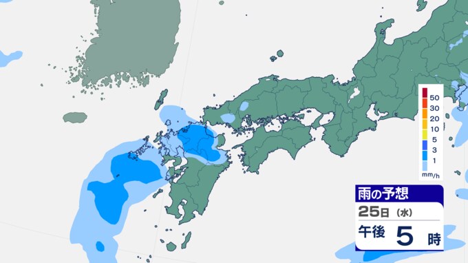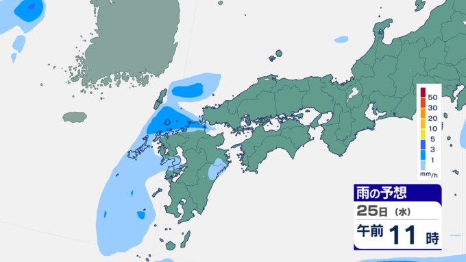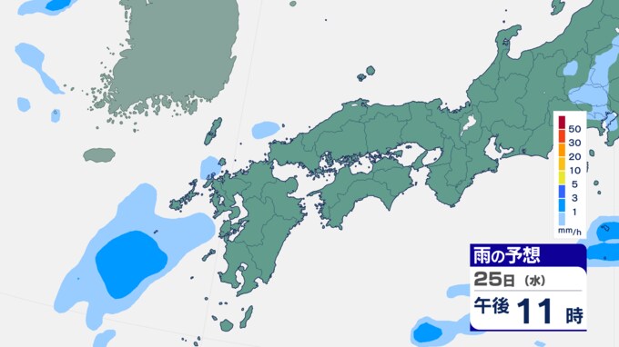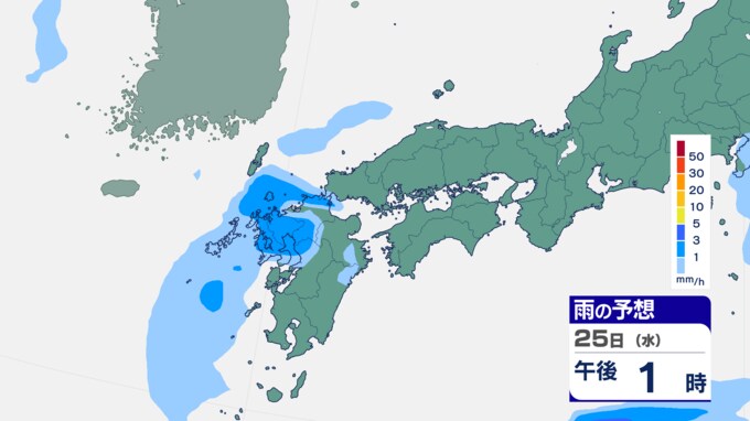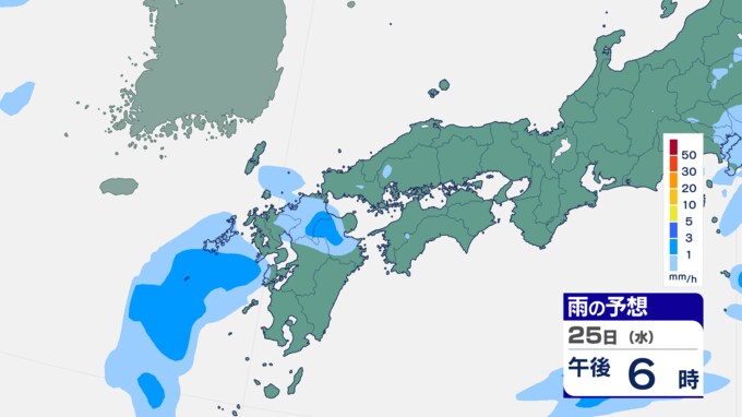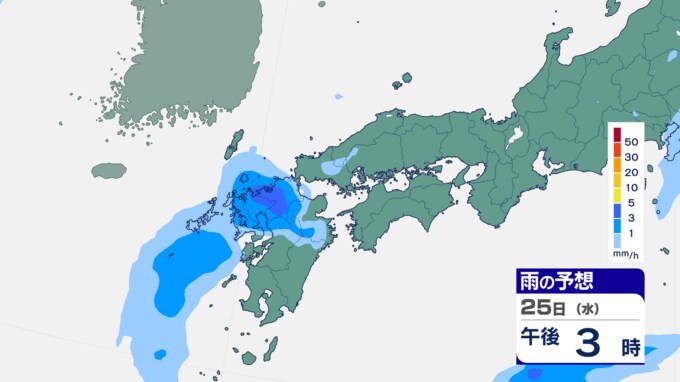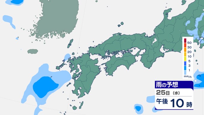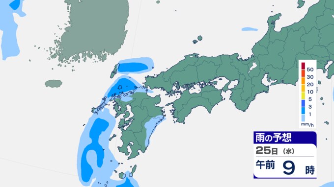25日は九州に断続的に雨雲かかる予想 南海上の熱帯低気圧から湿った空気 24時間雨雲予想(25日午前) 2024年9月25日(水) 10:05 国内 前線はさらに東へと離れ、南海上にある熱帯低気圧周辺の暖かく湿った空気が沖縄や九州に流れ込んでいます。そのため25日は、沖縄や九州で断続的に雨となる予想です。熱帯低気圧が台風に変わるおそれはない見込みです。