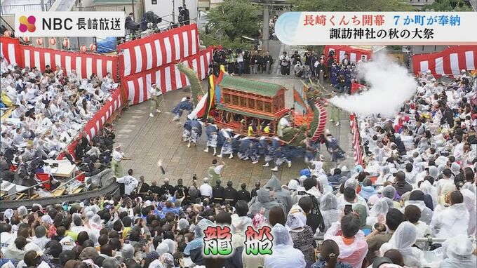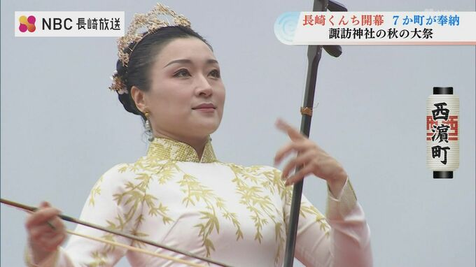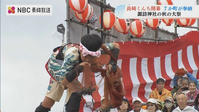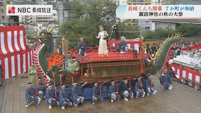 龍船(じゃぶね)はくんち最大級の船。15人の新人を含む21人の根曳たちが勇壮な船廻しを披露しました。