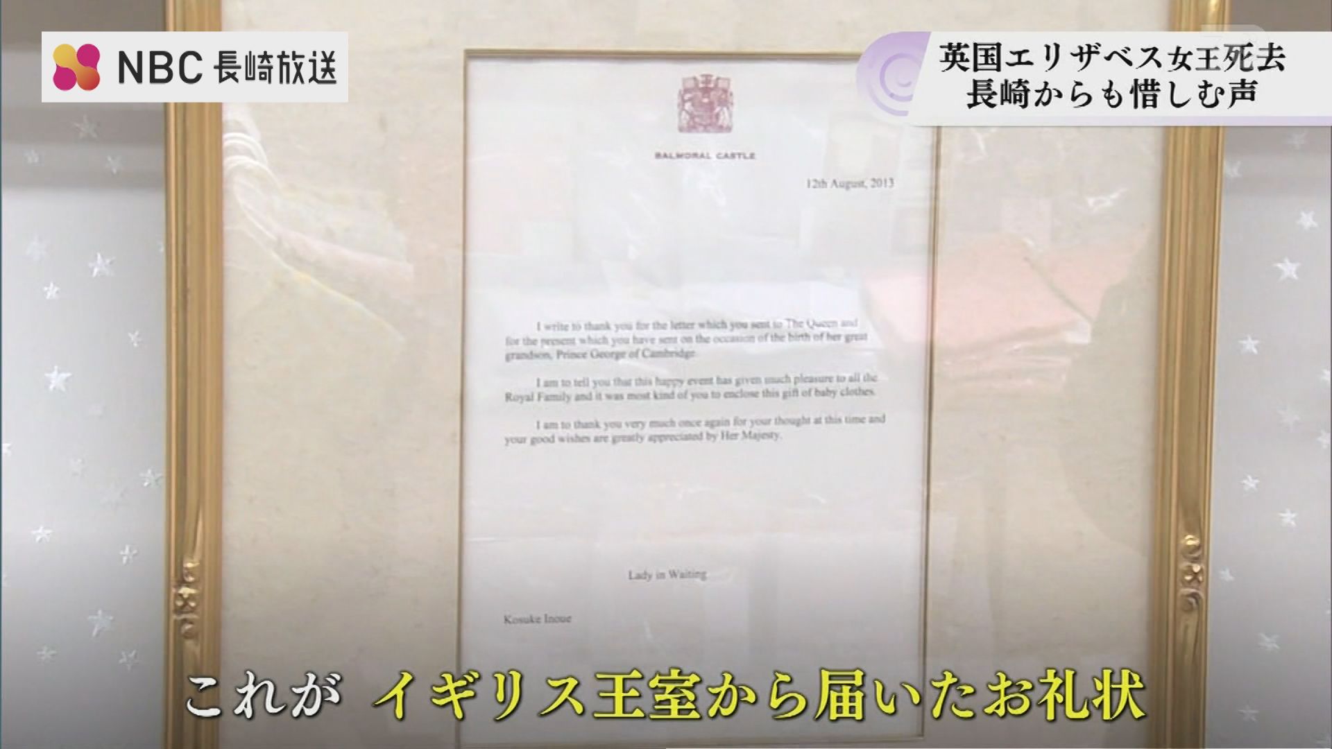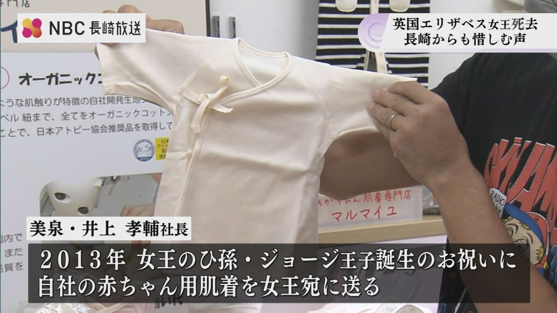 「美泉」の井上社長が、9年前、女王のひ孫・ジョージ王子誕生のお祝いに、自社の赤ちゃん用肌着を女王宛に送ったところ、イギリス王室からお礼状が届いたのです。