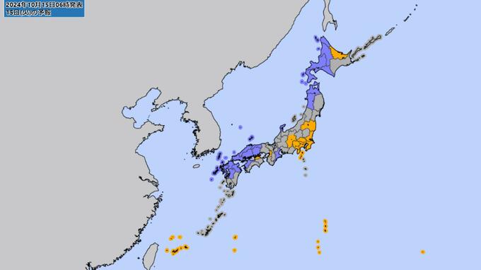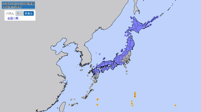 晴天をもたらした高気圧は徐々に東へ移動、高気圧のふちをまわった湿った空気が流れ込み、朝鮮半島を中心に雲が広がっています。15日は九州北部・中国地方を中心に雨予報、16日は四国や近畿・中部・東北・北海道地方にも雨の範囲が広がる予想です。(15日午前現在予報)