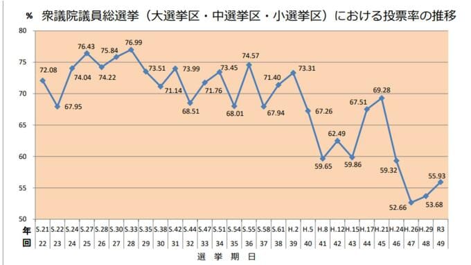 10月27日(日)は、第50回衆議院議員総選挙の投票日です。忘れずに投票に行きましょう。2021年の投票率は「55.93%」で、2017年よりはアップしたものの、戦後3番目に低い水準でした。都道府県別では山形県が「64.34%」で、衆院選では2回連続、参院選も含めると直近の国政選挙で3回連続のトップでした。一方、最下位の山口県は「49.67%」と50%に届きませんでした。あなたが住む町は?そして今回は?
