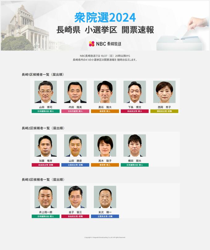 【開票速報】第50回衆議院議員総選挙・長崎県小選挙区NBC長崎放送WEBページ 2024年10月27日(日) 22:36 国内 NBC長崎放送では 10/27(日)20時以降から、 長崎県内の3つの小選挙区の開票速報を 随時お伝えしています。 NBC開票速報ページ