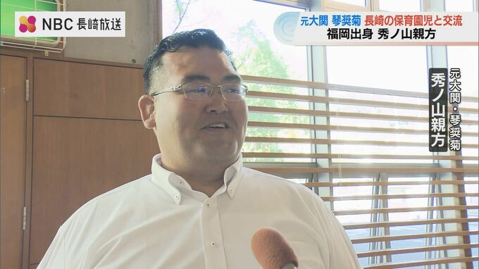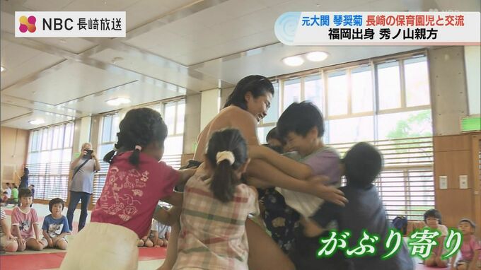 元大関・琴奨菊の秀ノ山親方が率いる部屋の力士たちが30日、長崎市を訪れ園児とふれ合いました。