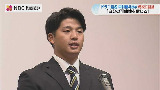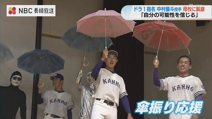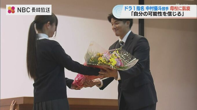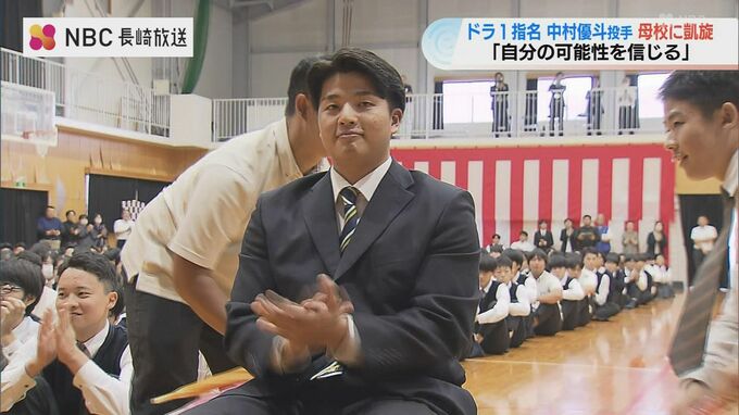 2024年のプロ野球のドラフト会議で東京ヤクルトスワローズから1位指名を受けた中村優斗投手が、31日母校の諫早農業高校に凱旋し、およそ800人の後輩が迎えました。