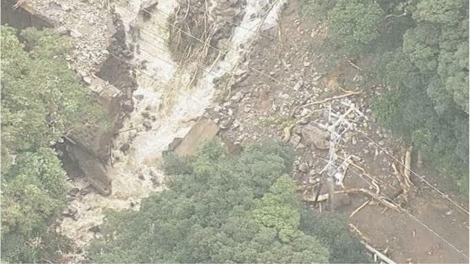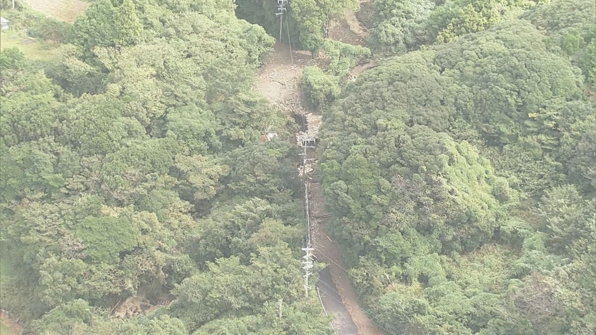 上空からの映像からは山頂付近の山肌が大きく崩れているのが確認でき、流れ出た大量の土砂が県道19号の一部を押し流したとみられます。土砂は谷間を通って海に大量に流れ出ています。