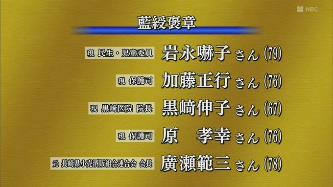 社会福祉などに尽力した人に贈られる藍綬褒章には、西海市で長年民生・児童委員として活動する岩永嚇子さんなど5人が選ばれました。