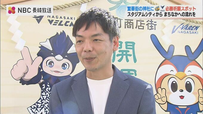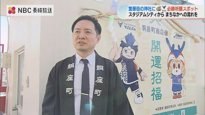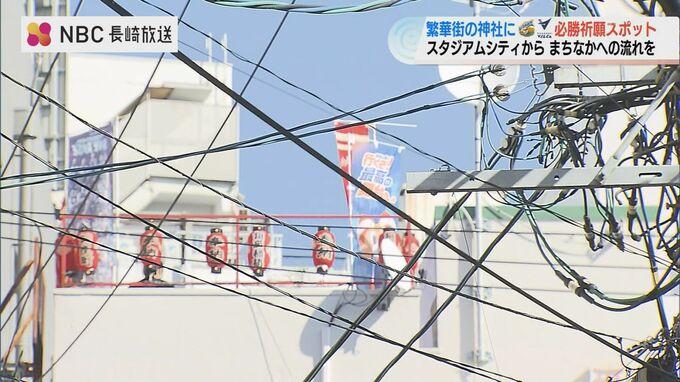 必勝祈願フォトスポットが誕生したのは、長崎市の繁華街、銅座町のビルの屋上にある「銅座稲荷神社」です。「長崎スタジアムシティ」の開業効果を広く波及させようと銅座町商店街組合などが企画、6日のお披露目式には商店街やV・ファーレンの関係者などが参加しました。