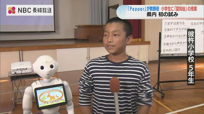 人型ロボット「Pepper」による授業を受けたのは、長崎県東彼杵町立彼杵小学校の5年生33人です。「Pepper」が、認知症の特徴やサポートの仕方について、子供たちにクイズ形式で問いかけました。