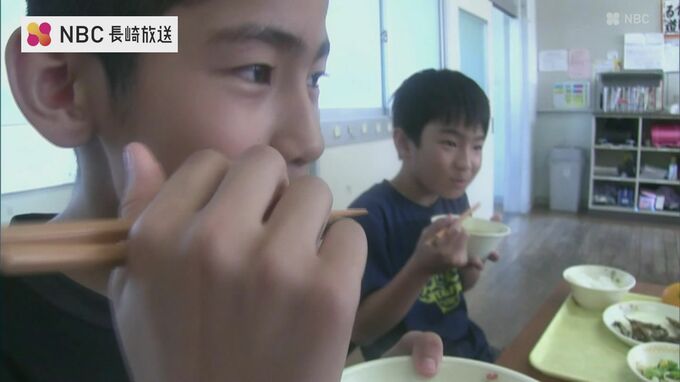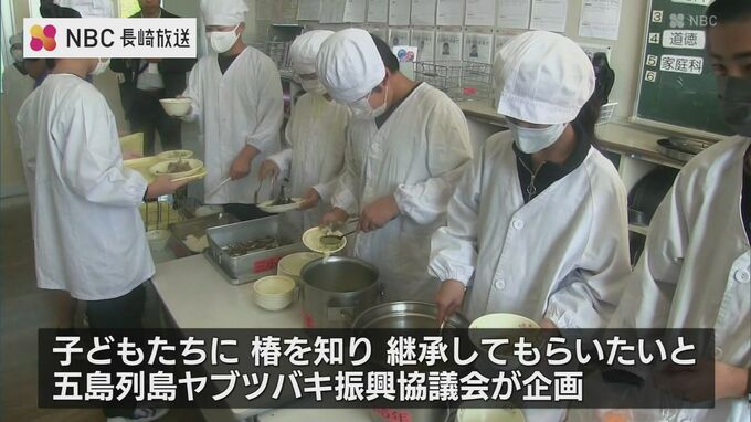椿の島として知られる五島市の三井楽小中学校で、椿油や椿茶などを使った給食が初めて提供されました。