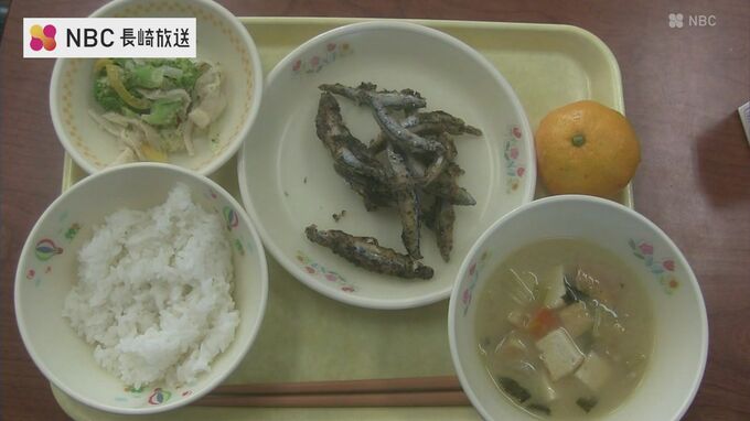 椿油などを使った給食は、子どもたちに地域の宝・椿を知り、継承してもらいたいと五島列島ヤブツバキ振興協議会が企画し13日、三井楽小中学校で提供されました。