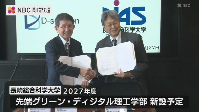 長崎総合科学大学は、2027年に、再生可能エネルギーや人工知能などを複合的に学べる学部をつくる予定で、その分野に精通する会社として、ディーソルらと長崎スタジアムシティで包括連携協定を結びました。