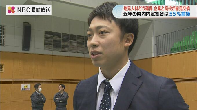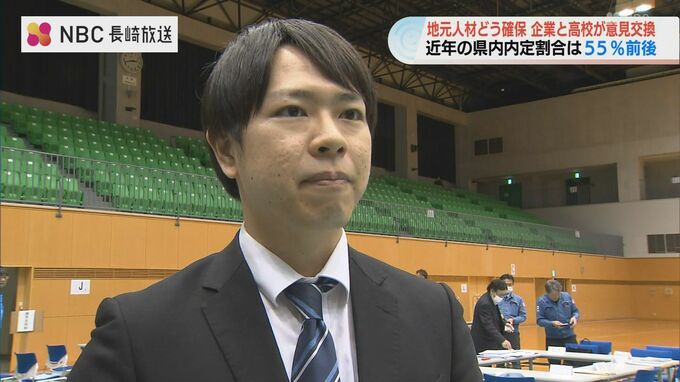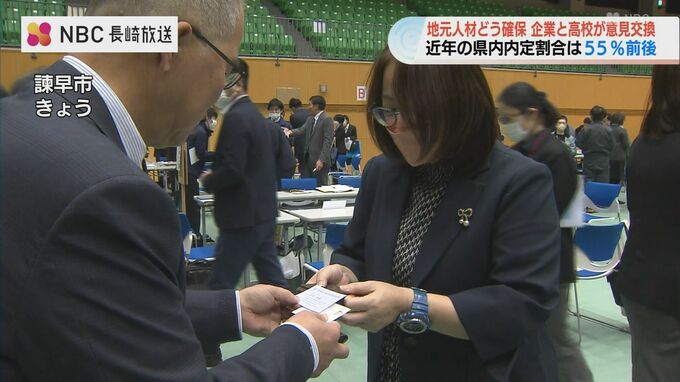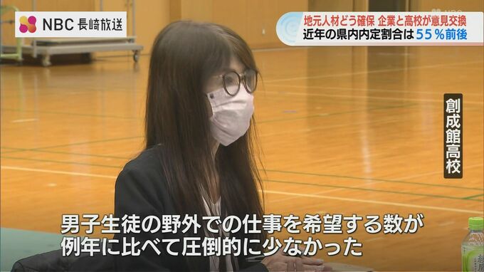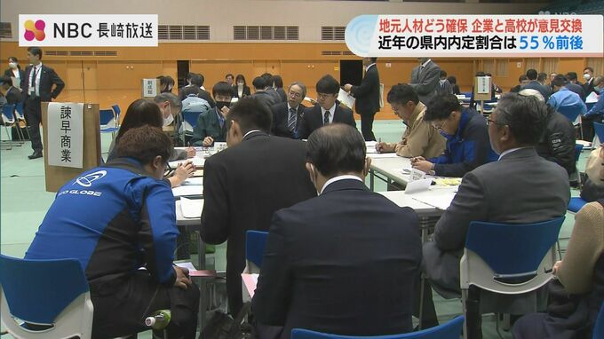 意見交換会には、長崎県内の企業およそ60社が参加。公立や私立の高校10校が設けたブースを回って、生徒が就職先に求める条件などを探りました。長崎労働局によりますと、就職を希望する高校生の県内企業への内定割合は、コロナ禍以降55%前後に留まっています。