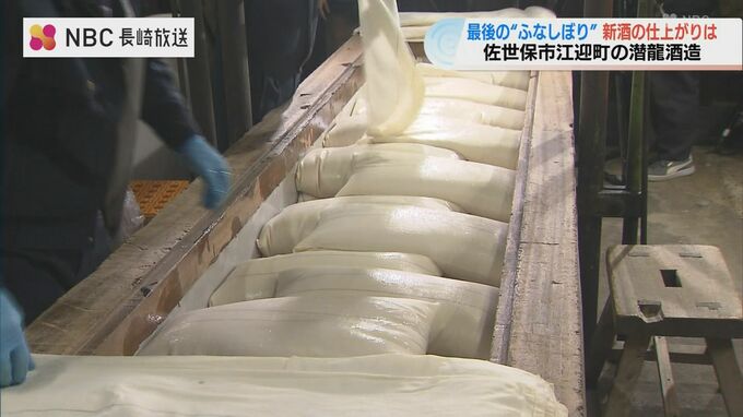 佐世保市江迎町の潜龍酒造では、この秋に仕込んだ新酒の初しぼりが行われました。もろみを酒袋に入れ槽(ふね)と呼ばれる木枠に、抱きかかえるようにして並べていきます。