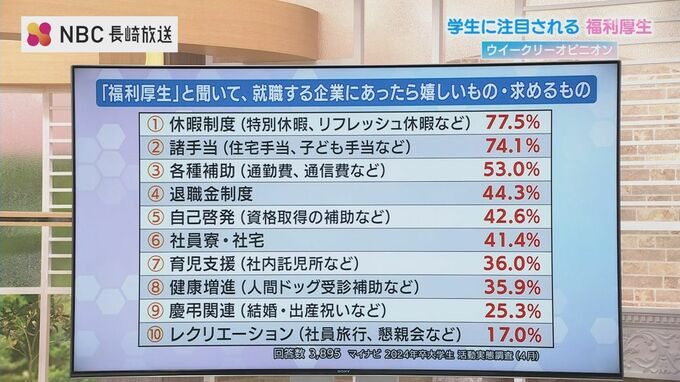 就職情報を提供する「マイナビ」の調査によりますと、”あったら嬉しい”または”求める”と答えた数で、特別休暇などの「休暇制度」が77.5%で最も多く、次いで住宅手当や子ども手当などの「諸手当」、通勤費などの「各種補助」と続きます。