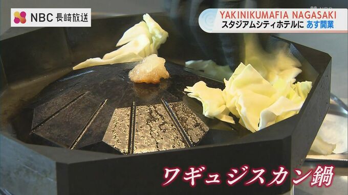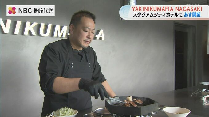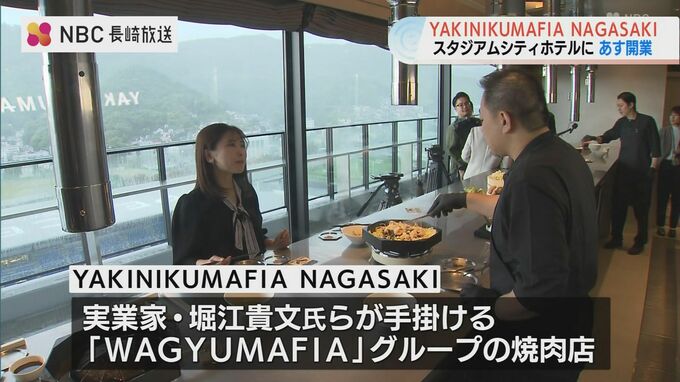 長崎市幸町の「スタジアムシティホテル長崎」14階に、11月29日にオープンした「YAKINIKUMAFIA NAGASAKI(ヤキニクマフィア ナガサキ)」。実業家の堀江貴文さんらが手掛ける「WAGYUMAFIA」グループの焼肉店で、‟幻の和牛”とも呼ばれる「尾崎牛」の経産牛を使用した焼肉を提供します。