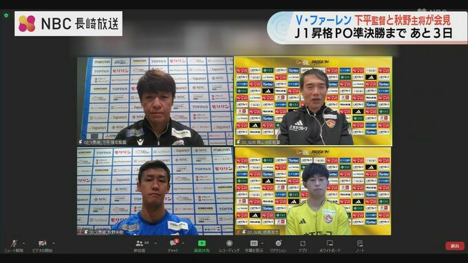 12月1日に行われるJ1昇格プレーオフの準決勝、仙台戦を前に、V・ファーレン長崎の下平監督と秋野キャプテンが、28日オンライン会見に臨みました。