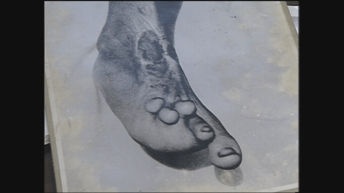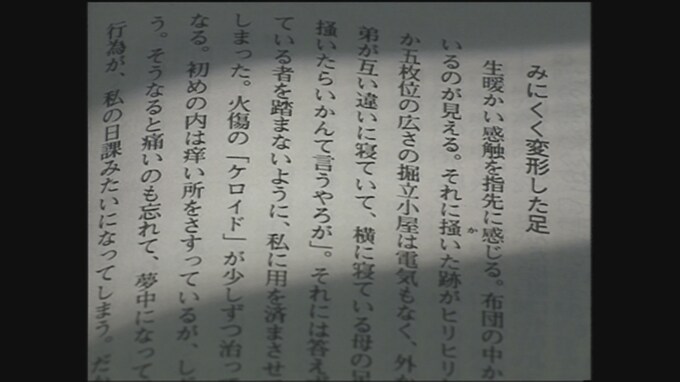 原爆の熱線によって、両手足や腹部、足にやけどを負い、右足はケロイドで変形。小峰さんは真っすぐに歩くことができず、横歩きで小学校に通学し「腐れ足」などとあだ名をつけられるなど苛烈ないじめや差別を受け続けました。
