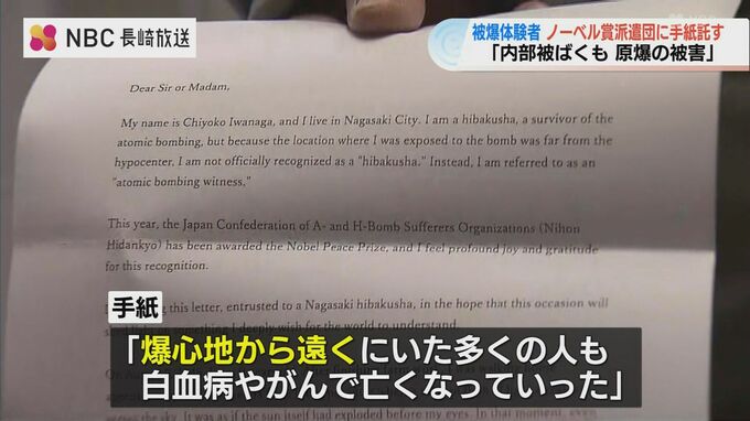 手紙には、爆心地から遠くにいた多くの人々も白血病やがんで苦しみ亡くなっていったと綴られており、埋もれた被爆者の存在を知り核兵器廃絶につなげるよう求めています。