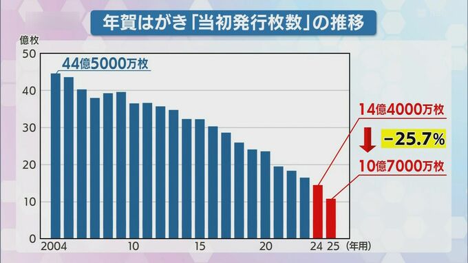 「メールやSNSなどの広がりなどにより、”当初発行枚数”は14年連続で減少しています。郵便料金改定の影響だけでは考えることは難しいですが、お客様の需要などを総合的に勘案して(来年用の)当初発行枚数は過去最高の下がり幅となっています」