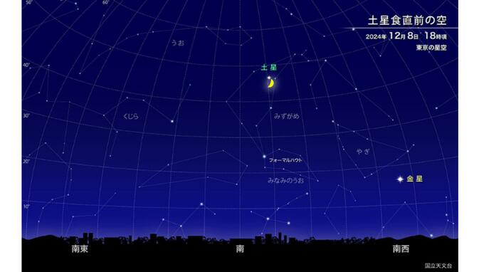 12月8日の土星食が見られたのは、日本列島の南東側の地域です。今回の土星食は、12月8日(日)午後6時~7時の間に、南の空の高いところにある月が、土星を隠しました。