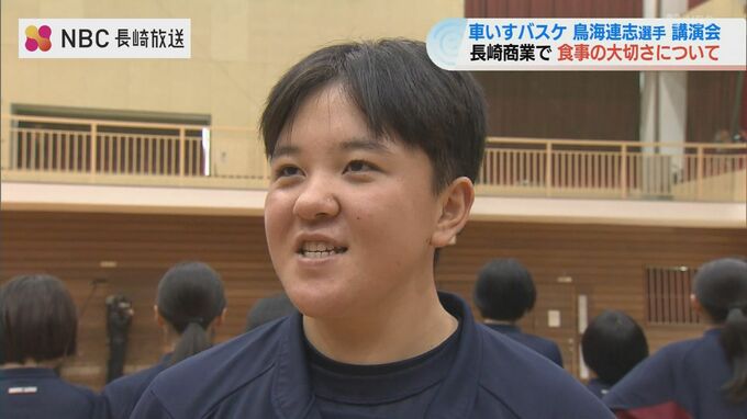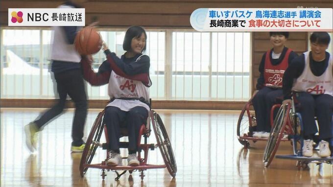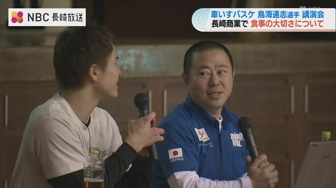 長崎出身で車いすバスケットボール日本代表の鳥海連志選手が11日長崎商業高校を訪れ、高校生に食事の大切さについて語りました。