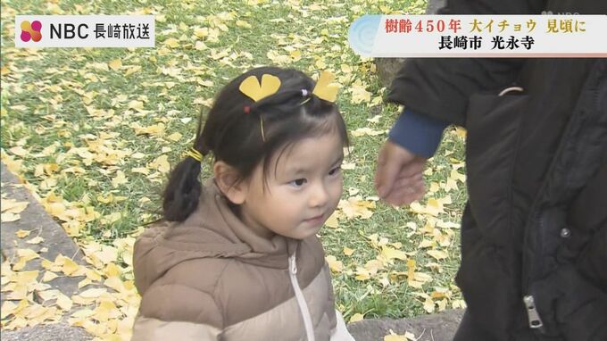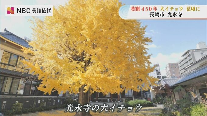 長崎市の光永寺にある「大イチョウ」が見ごろを迎えています。樹齢はお寺よりも古い450年。日の光を浴びたそのまぶしい姿に、毎年多くの人が魅了され、癒され、ひと息ついて、感謝を伝える姿がみられます。