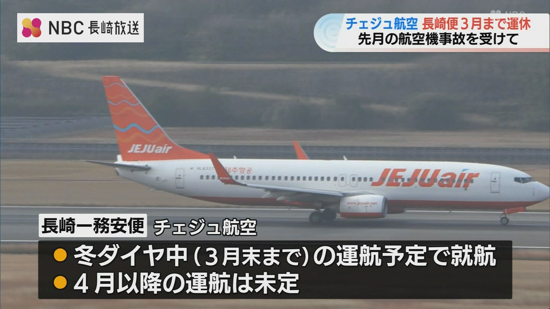 韓国・チェジュ航空の長崎空港と韓国・務安空港を結ぶチャーター便が、先月の航空機事故を受けて、3月下旬まで運休することになりました。