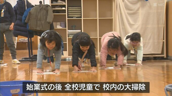 式の後、清々しい1年のスタートにしようと全校児童で校内の大掃除を行いました。(1年生)「Q.冬休みは楽しかったですか」「はい」(5年生)「いろいろと手伝わされて面倒くさかった冬休みです」「祐徳っていう神社に家族が長生きできますようにってお願いしました」(5年3組全員)「3学期がんばるぞ」