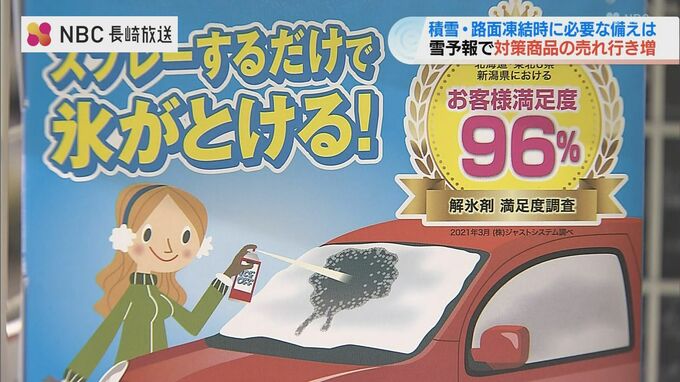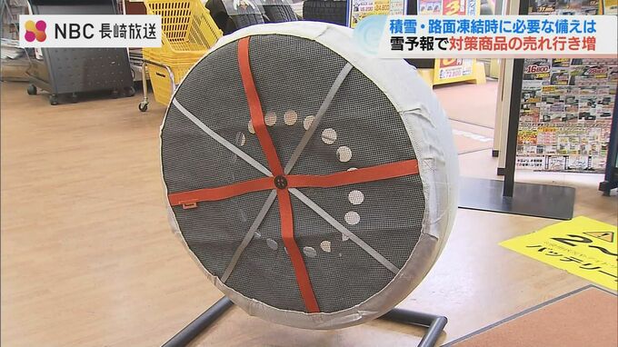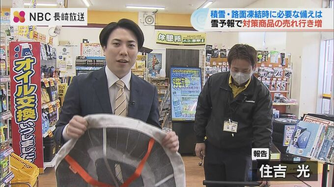 店頭には「雪予報」の文字。40~50種類の雪対策商品を取り揃えている長崎市のカー用品店です。