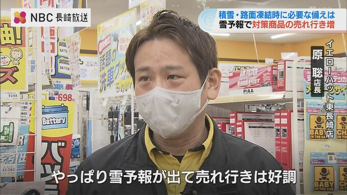 「雪予報が出て、売れ行きは好調です。窓ガラスの解氷剤や(タイヤの)チェーンが良く動いています」