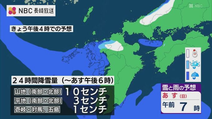 11日午後6時からの24時間降雪量は、多い所で、南部・北部の山地で10センチ、南部・北部の平地で3センチ、壱岐・対馬と五島で1センチと予想されています。