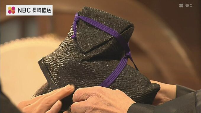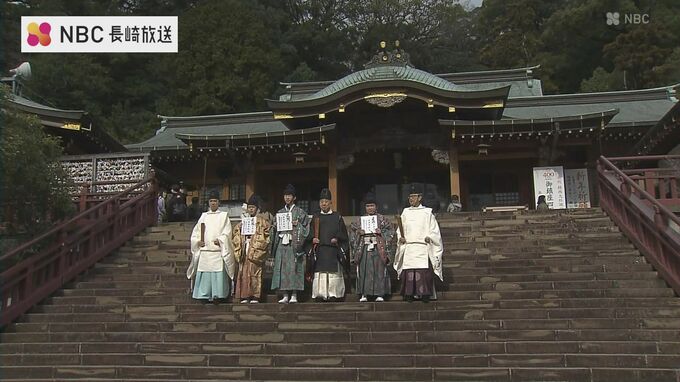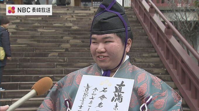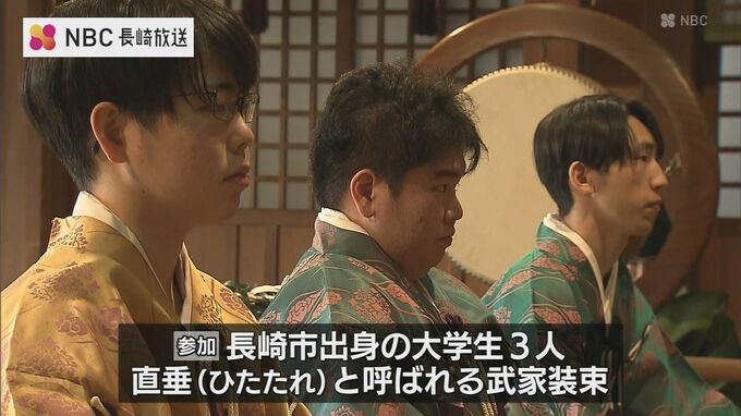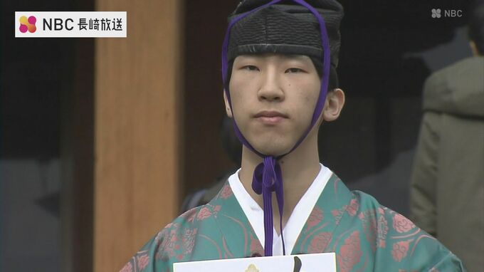 毎年、二十歳を迎える男性が参加していて、今年は長崎市出身の大学生3人が選ばれ直垂(ひたたれ)と呼ばれる武家装束に身を包み、式に臨みました。