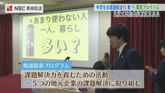 長崎市の精道三川台中学校で4年前から行われている「精道探求プログラム」。社会で必要とされる課題解決力を育むための活動で、今年はチョーコー醤油や九州教具グループなど5つの地元企業の課題に中学生ならではの視点で向き合いました。1年生から3年生まで縦割りグループで経営者へのインタビューや会社見学、実験など4カ月かけて準備した成果を発表しました。
