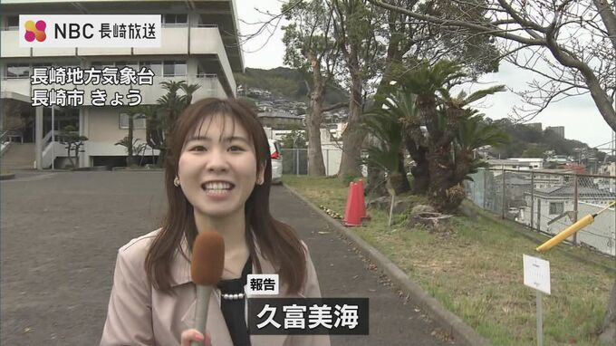久富美海アナウンサー「週末のぽかぽか陽気から一転、冷たい風が吹く今朝の長崎市ですが、ここには春が訪れました!桜、開花発表です」