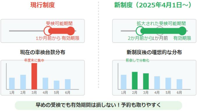 現在、車検は「有効期限の1か月前」から受けられますが、このルールが4月1日から変わります。