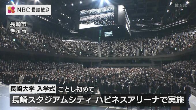 今年初めて長崎スタジアムシティのハピネスアリーナで行われた長崎大学の入学式。去年より22人少ない2213人が門出の日を迎えました。
