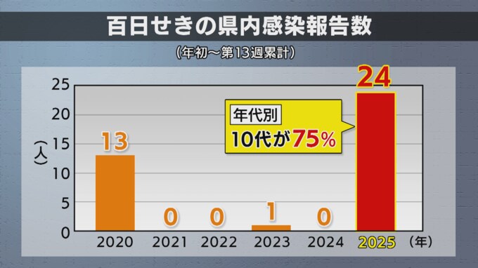 長崎県によりますと、県内のことし初め~先月30日までの「百日せき」の感染報告は24件で、全数把握するようになった2018年以降、最多のペースで増えています。年代別では10代が75%を占めています。