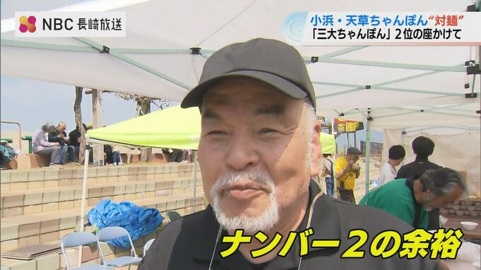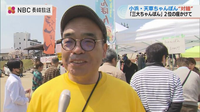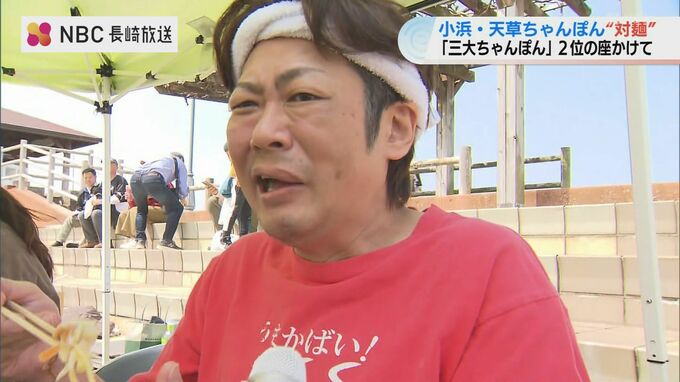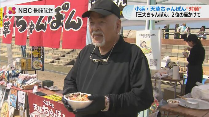 天草ちゃんぽん連絡協議会・永田文明会長「小浜ちゃんぽんはですね、地元のやつ(食材)をふんだんに使ってまして、かまぼことか。麺も前はちょっと白っぽい麺だった、今はまたおいしくなってますもんね、もっちりして。で、そういうところがあんまり遜色なくて。ま、良きライバルなんですけど。対決はあんまり私は好みませんので、食べ比べということで」