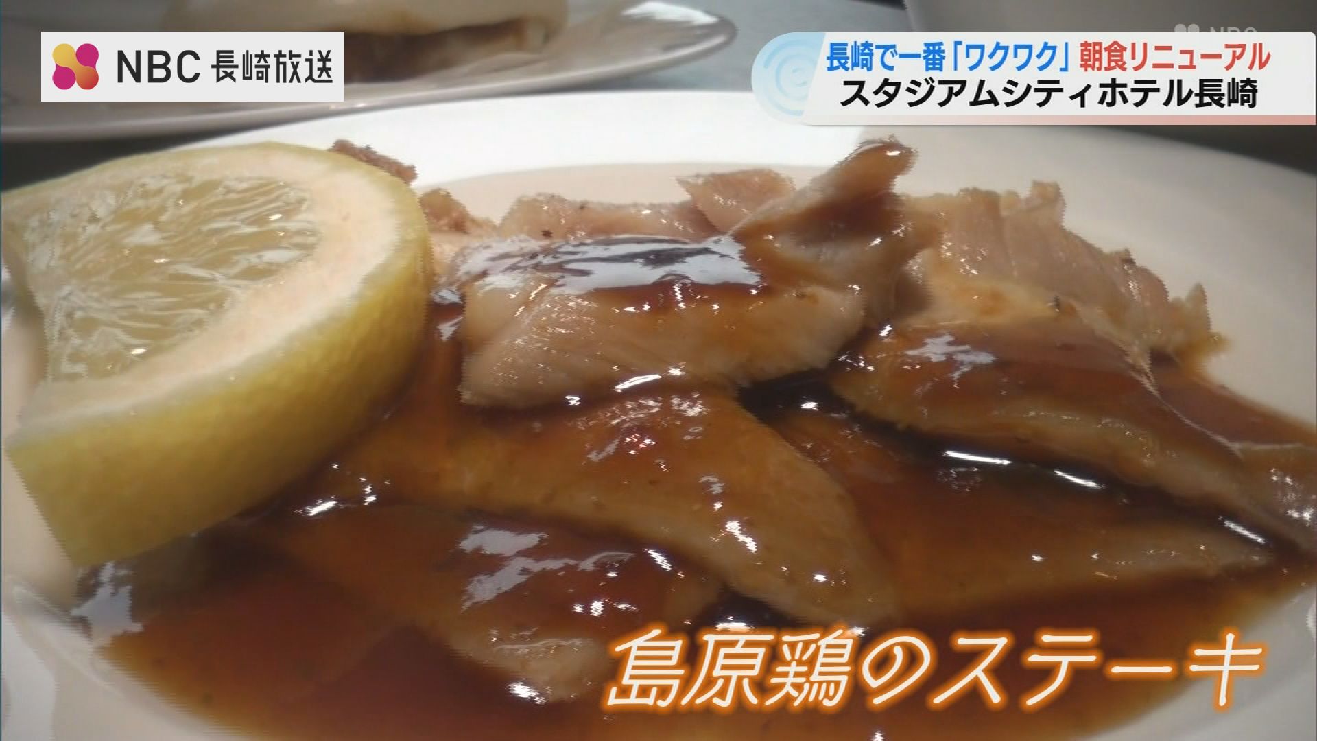 記者「どれにしようか迷いますが、こちら島原鳥のステーキいただきます。柔らかくてすごくおいしいです。レモンがかかっているので朝からでもさっぱり食べれらるそんなメニューになってます」