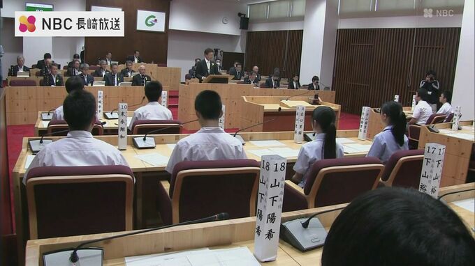 五島市議会の議員席に座るのは五島高校や五島海洋高校などに通う生徒18人です。