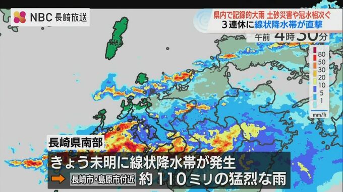 前線の南下に伴って線状降水帯が発生した県南部では長崎市と島原市付近で11日未明に約110ミリの猛烈な雨が降ったとみられています。また8日の降り始めからの雨の量は各地で300ミリを超えています。